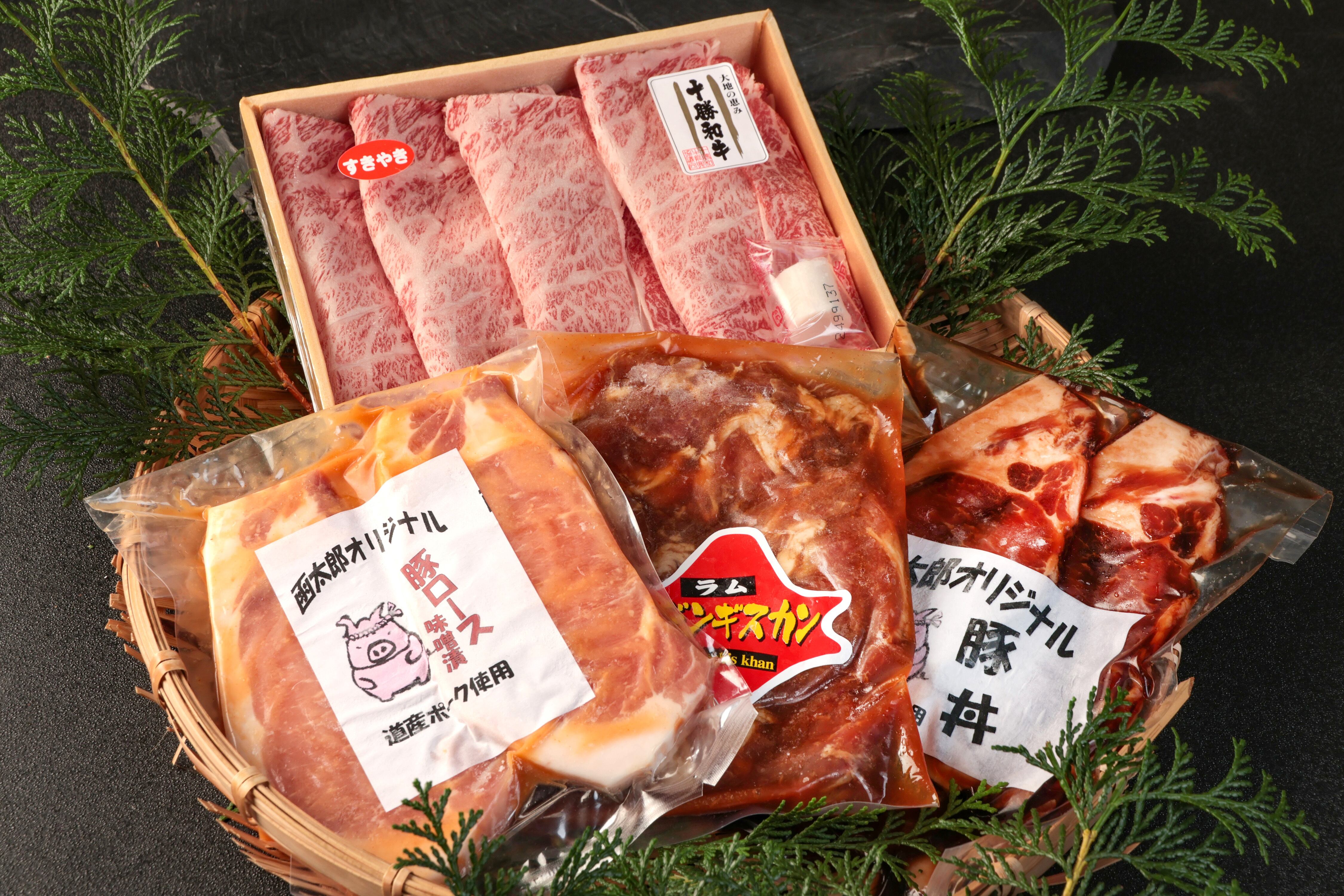 十勝和牛は、通常より長期間肥育、きめ細かい肉質と霜降りが特徴です。肉の旨味と脂の芳醇なコクをお楽しみいただけます。定番の味付ジンギスカン、ジューシーな豚ロース、風味豊かな味噌漬け。北海道の豊かな自然で育まれたお肉を、贅沢に味わえるセットです。